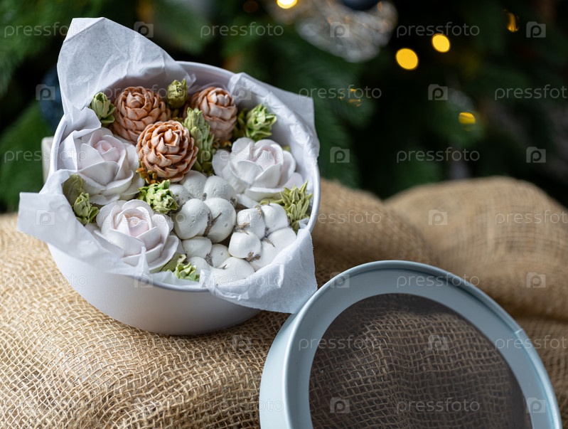 Зефирный букет цветов в подарочной коробке на фоне елки, концепция праздничного настроения