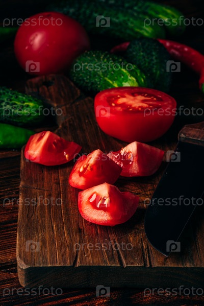 Нарезанные помидоры на разделочной доске и огурцы с перцем чили