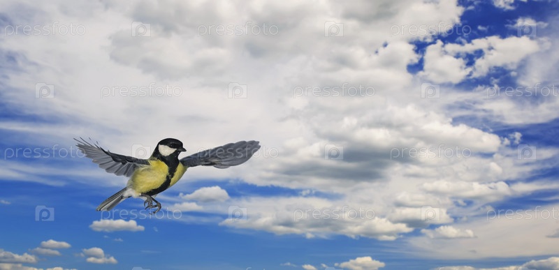 Синица летит, расправляя крылья на голубом фоне неба с белыми облаками