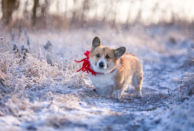 Милый щенок корги гуляет в зимнем солнечном парке в красном шарфе