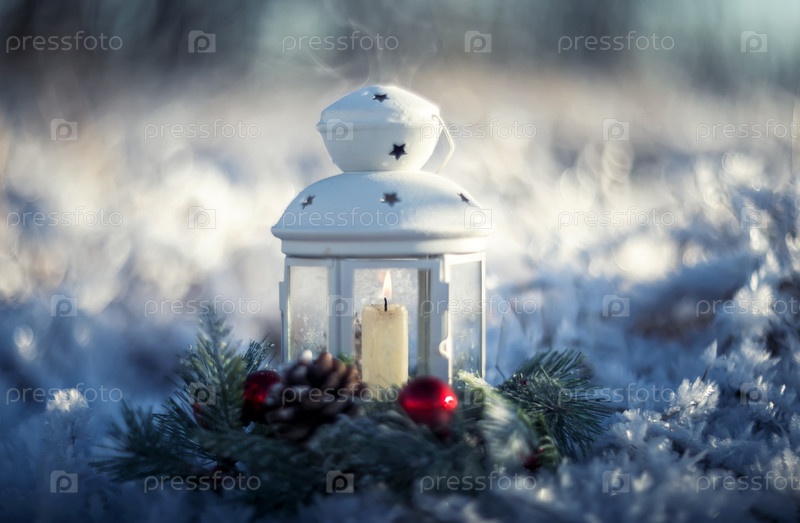 Праздничная рождественская открытка свеча горит в элегантном еловом венке стоит в новогоднем саду среди снега