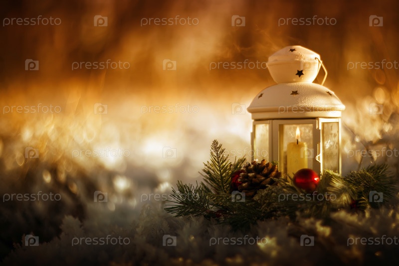 Праздничная рождественская открытка свеча горит в элегантном еловом венке стоит в новогоднем саду среди снега