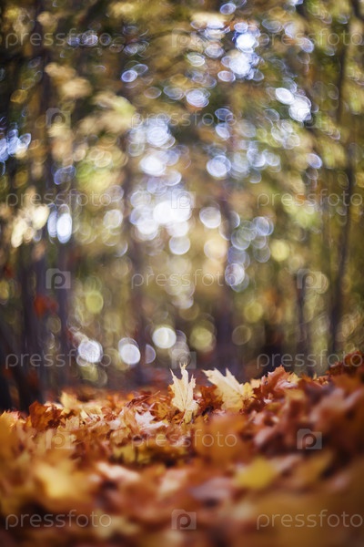Естественный фон с видом на осенний солнечный парк с опавшей золотой листвой