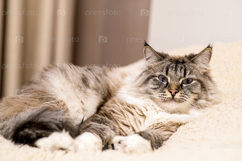 Очень пушистый кот на кровати в спальне