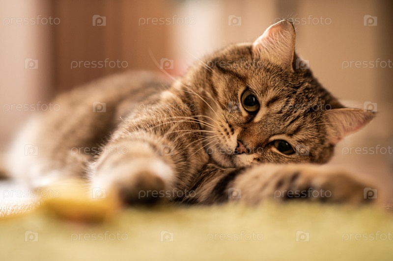 Полосатый кот играет с мышкой