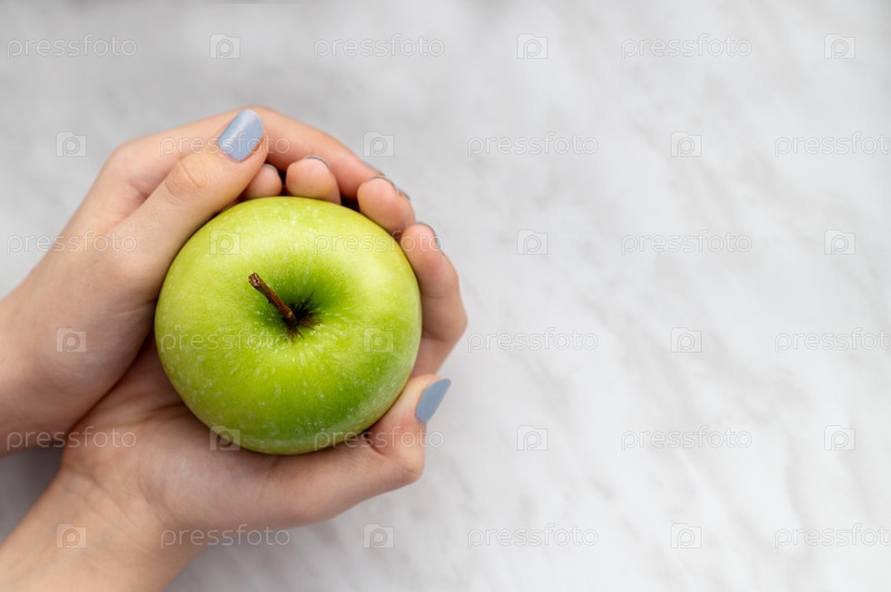 Зеленое яблоко в руках на мраморном фоне
