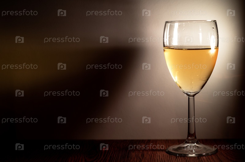 Бокал с вином стоит на деревянной полке. На него падает свет