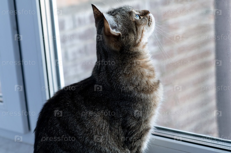 Полосатый кот смотрит в окно. Он увидел муху на окне