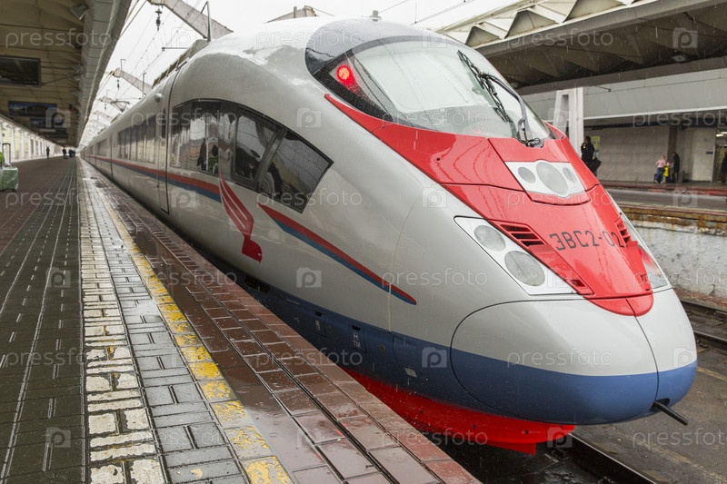 Россия. Санкт-Петербург. Железнодорожный транспорт. Скоростной поезд Сапсан у платформы на вокзале. Пассажиры на перроне. Россия. Санкт-Петербург. Железнодорожный транспорт. Высокоскоростной поезд Sapsan на платформе на станции. Пассажиры на платформе