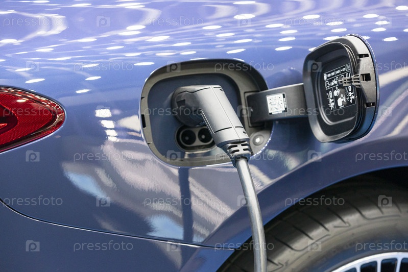 Россия. Санкт-Петербург. Автомобиль с электродвигателем в процессе зарядки. Россия. Санкт-Петербург. Машина с электромотором находится в процессе зарядки