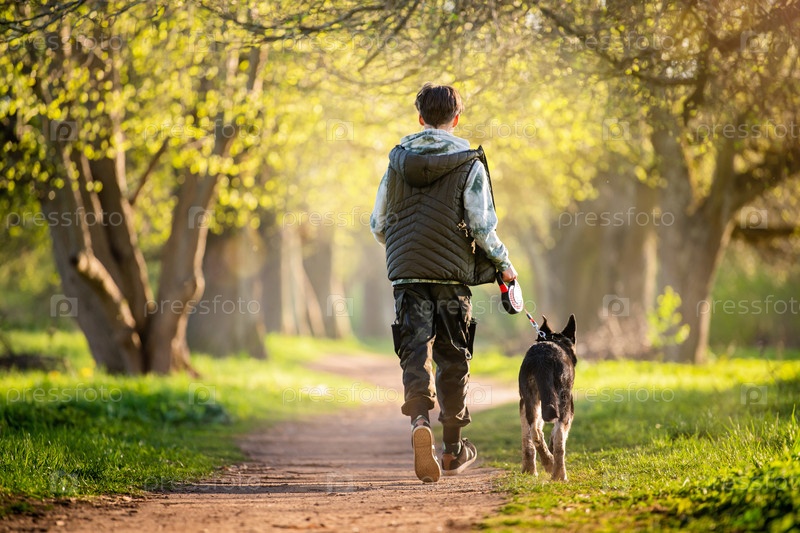 Мальчик с собакой гуляют в парке солнечным весенним вечером, бегут по дороге. Дружба человека и животного, здоровый образ жизни