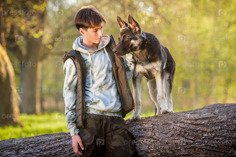 Мальчик с собакой гуляют в парке солнечным весенним вечером, сидят на траве. Дружба человека и животного, здоровый образ жизни
