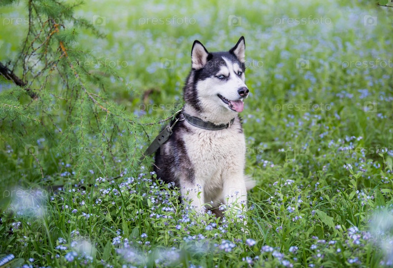 Черно-белый сибирский хаски стоит. Счастливая собака на природном ландшафте. Голубые глаза