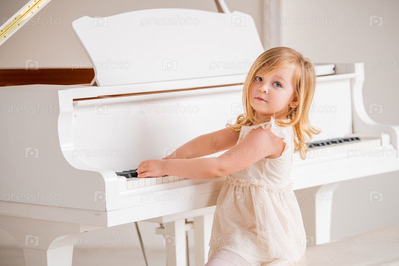 Маленький ребенок играет на большом белом пианино в яркой солнечной комнате