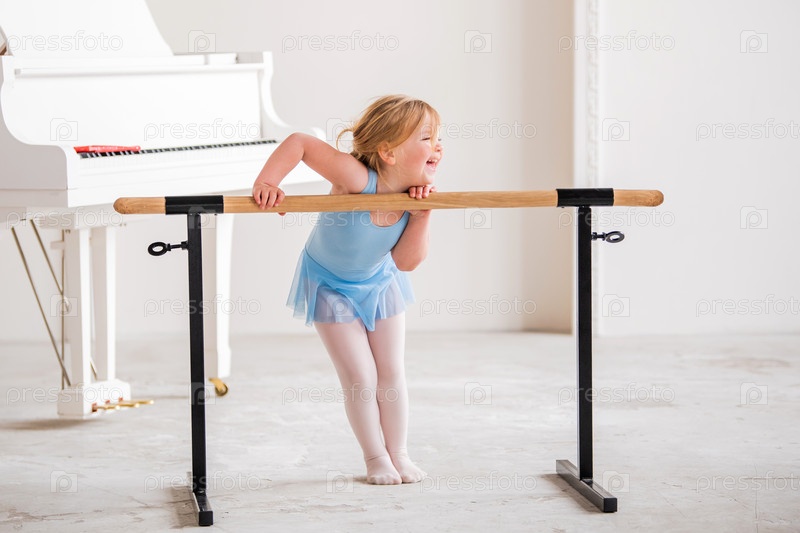 Симпатичная пухлая балерина в синем трико занимается балетными танцами у балетного станка в большом светлом классе
