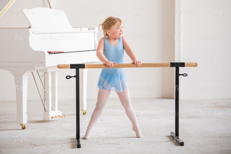 Симпатичная пухлая балерина в синем трико занимается балетными танцами у балетного станка в большом светлом классе
