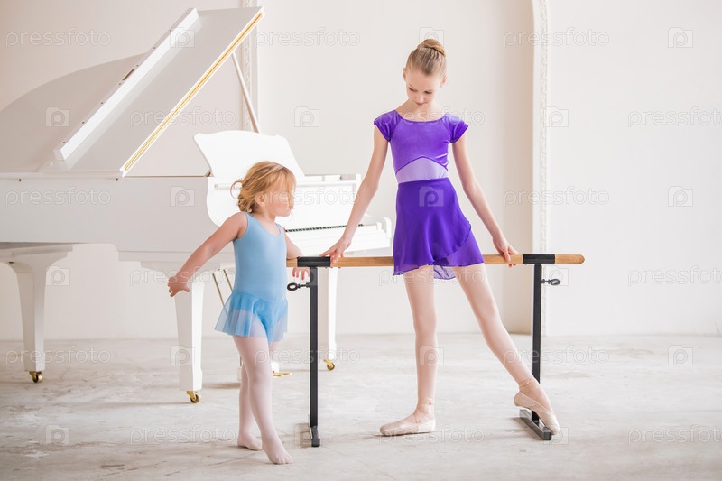 Маленькая милая пухленькая девочка смотрит на свою старшую подругу балерину, показывающую движение у станка
