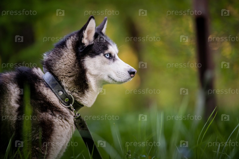 Черно-белый сибирский хаски стоит. Счастливая собака на природном ландшафте. Голубые глаза