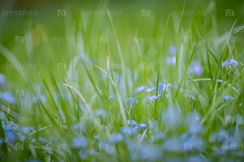 Цветочный фон. Цветы цветут на поле с размытым фоном. Водяная незабудка или скорпена-трава с небесно-голубыми лепестками. Весенний и летний луг. Съедобные садовые травы