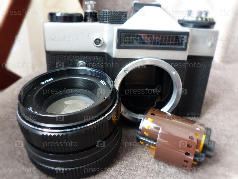 Старый однообъективный зеркальный фотоаппарат, объектив и пленка. Ретро