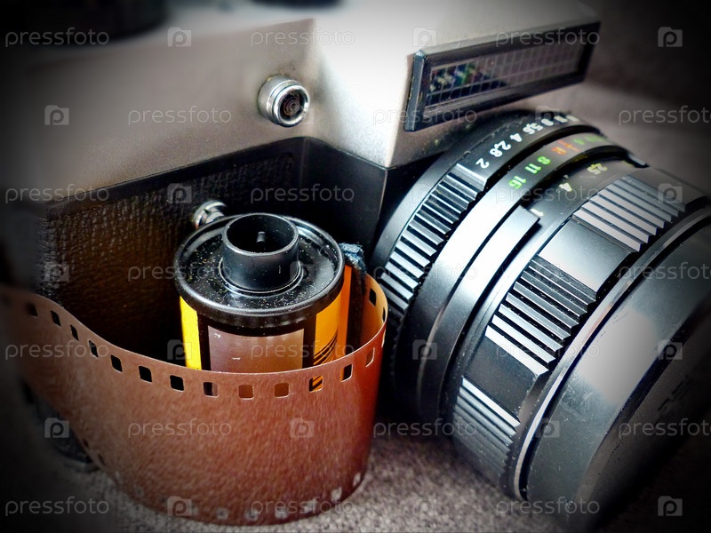 Старый однообъективный зеркальный фотоаппарат, объектив и пленка. Ретро