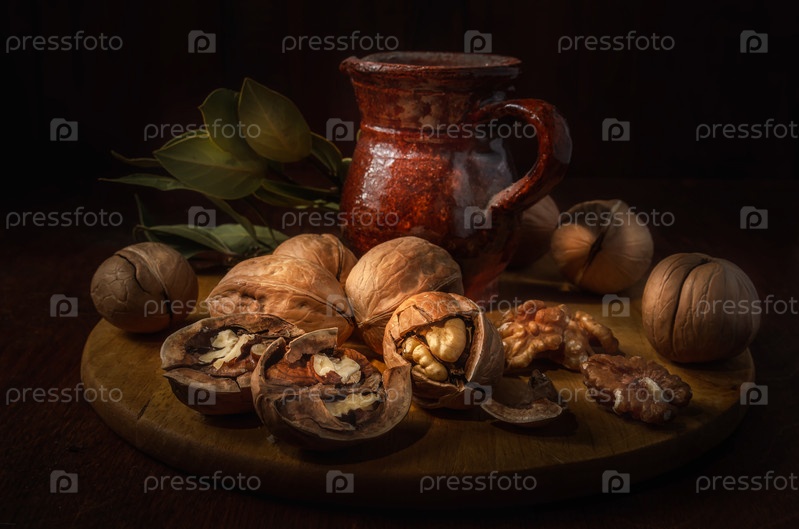 Грецкие орехи на темном фоне в деревенском стиле