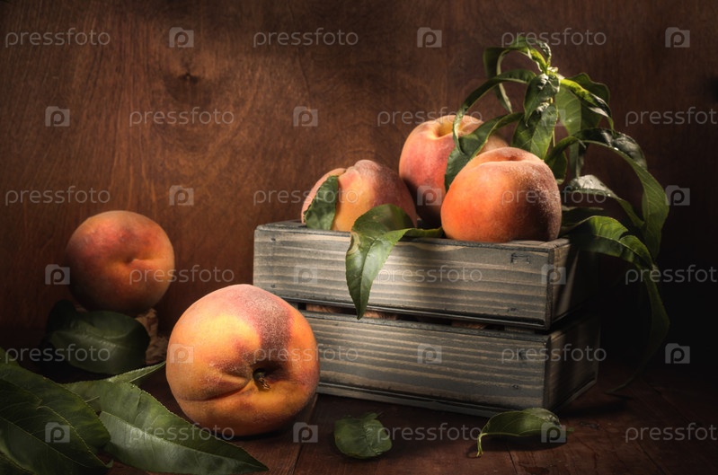 Спелые персики в деревянной коробке на темном фоне в деревенском стиле