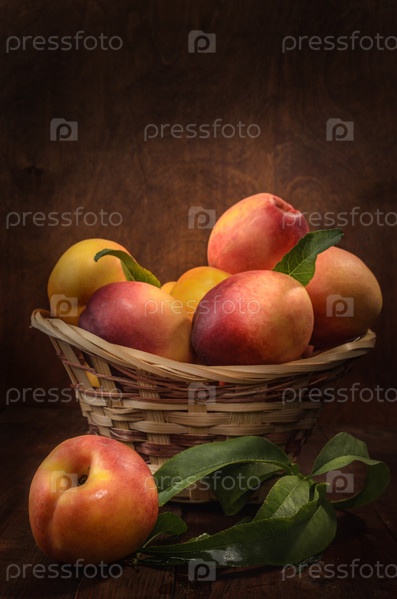 Нектарины в корзине на темном деревянном фоне в деревенском стиле