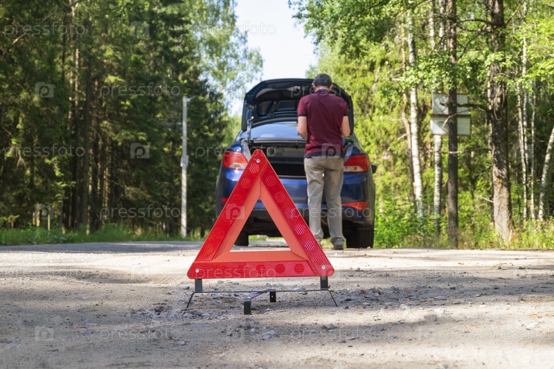 Переносной светоотражающий красный предупреждающий знак стоит на обочине дороги рядом с поврежденным автомобилем