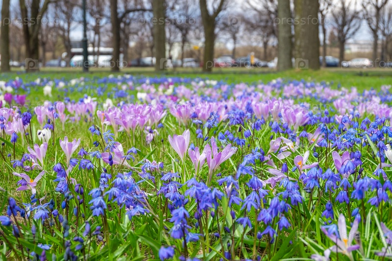 Крупный план первых весенних цветов пролески и крокусов в весеннем парке