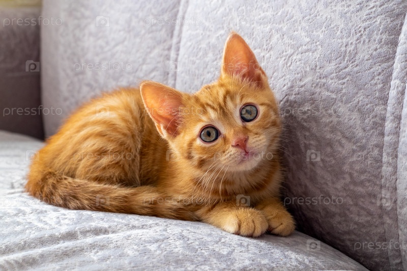 Маленький рыжий котенок табби лежит на диване