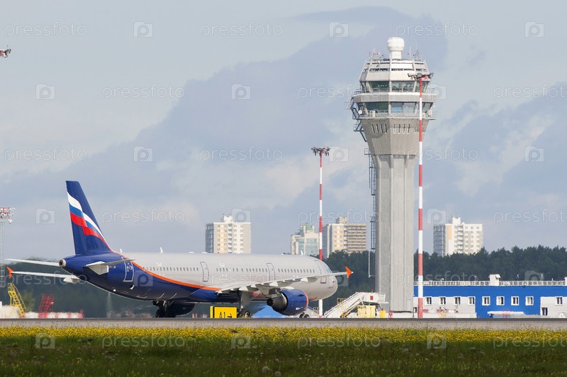 Россия. Санкт-Петербург. Самолет в аэропорту Пулково. Инфраструктура авиационной промышленности. Лайнер на фоне диспетчерской башни. Россия. Санкт-Петербург. Самолёт находится в аэропорту Пульково. Инфраструктура авиационной отрасли. Лайнер на задней пане