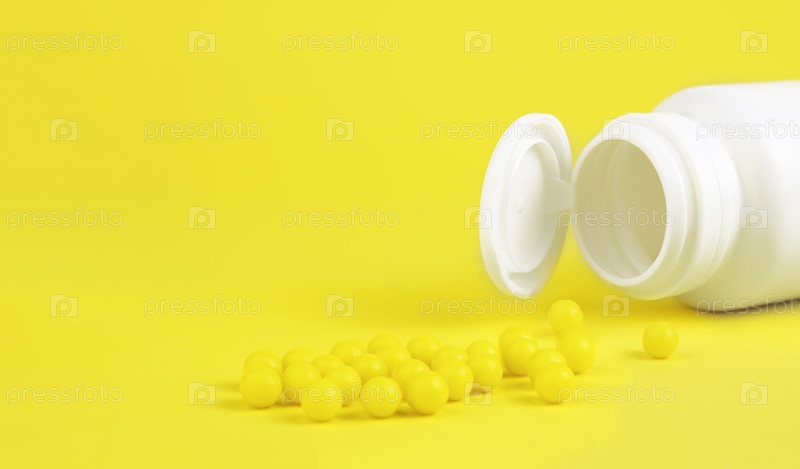 Желтые шарики высыпались из белой медицинской бутылки на желтом фоне. Витамин С. Медицина и здравоохранение, авитаминоз. Копировать пространство