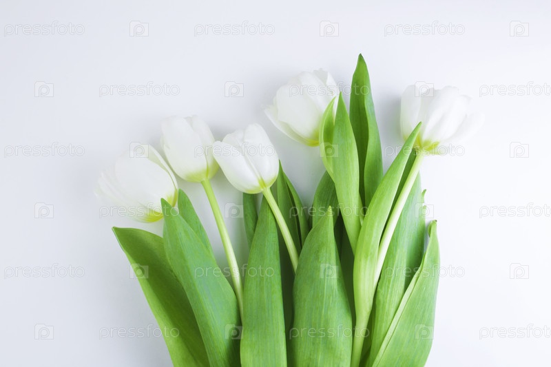 Белые тюльпаны на белом фоне. Концептуальная открытка с женским днем, днем матери, весенними цветами, баннером, приветствием. Копировать пространство