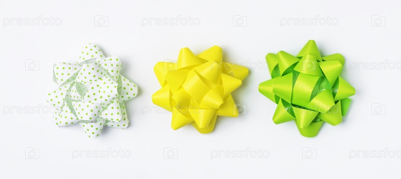Коллекция бантов, изолированных на белом фоне. Желтые, зеленые и белые луки в зеленый горошек, аналогичная комбинация. Концепция украшения, подарка, поздравления