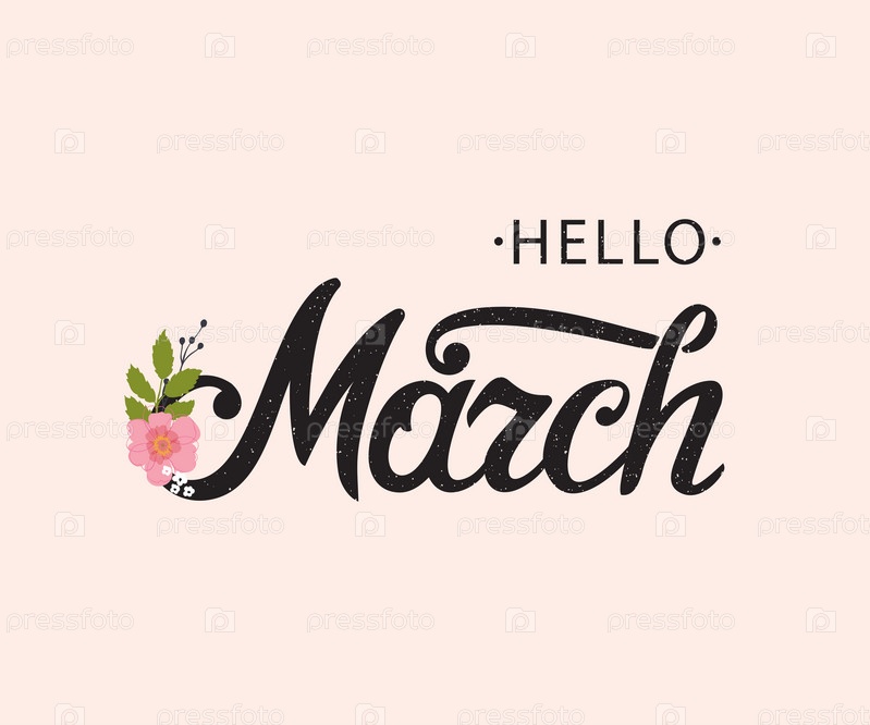 Здравствуйте, мартовский типографический векторный дизайн для поздравительных открыток и плакатов. Текст ручной надписи выделен на розовом фоне. Празднование шаблона дизайна. Векторная иллюстрация
