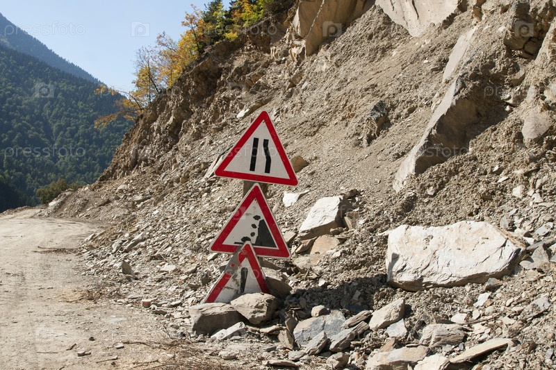 Россия. Санкт-Петербург. Грузия. Батуми. Дорожные знаки сход дороги и обвал на горной дороге. Россия. Санкт-Петербург. Грузия. Батуми. Road signs road convergence and collapse on a mountain road