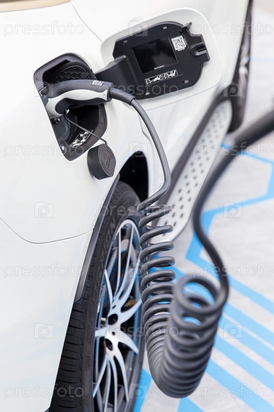Россия. Санкт-Петербург. XXIII Петербургский международный экономический форум 2019. Зарядка электромобиля. Россия. Санкт-Петербург. Процесс зарядки автомобиля электродвигателем