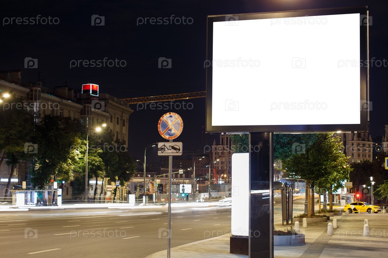 Большой горизонтальный рекламный щит в ночном городе. Дорога, следы фонарей движущихся автомобилей. Макет
