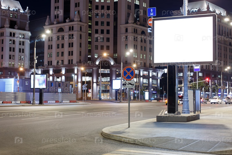 Большой горизонтальный рекламный щит в ночном городе. Офисные здания с ярким освещением. Макет