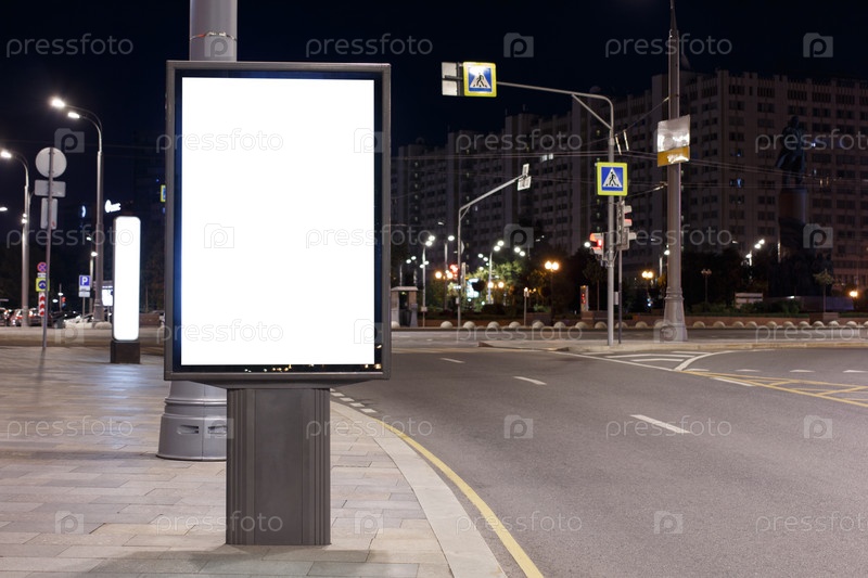 Вертикальная реклама на щите в ночном городе. Пешеходный переход на перекрестке. Макет