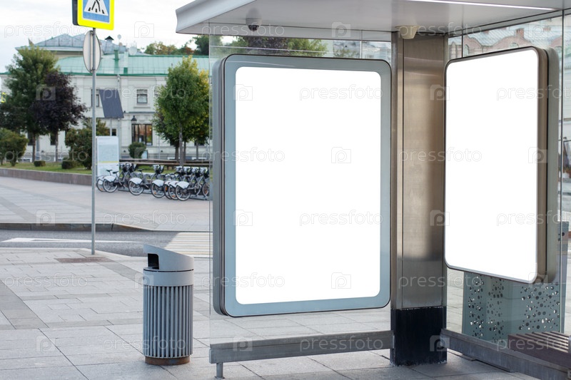 Пустой рекламный щит на автобусной остановке. Утро, крупный план. Прокат велосипедов. Макет