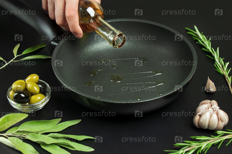 Рука повара наливает оливковое масло из бутылки в сковороду. Темный фон с зелеными и черными оливками, веточками розмарина и чесноком