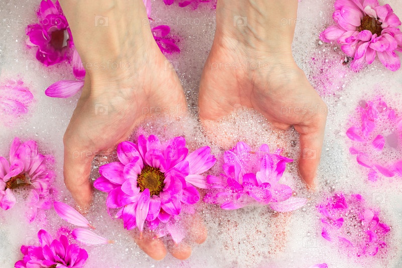 Крупный план женских рук в ванне с пеной, полной цветов и лепестков. Концепция ухода за телом, спа-кожа, натуральная косметика, чистота и благополучие. Вид сверху, плоская планировка
