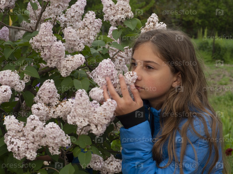 Девочка-подросток в синей куртке нюхает розовые сиреневые цветы. Молодая милая девушка наслаждается цветочным ароматом в весеннем саду. Сцена из реальной жизни. Счастье и удовольствие