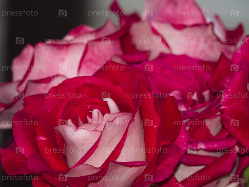 Красивый бутон розы с элегантными красными и кремовыми лепестками на фоне расфокусированных розовых цветов. Выборочная фокусировка с малой глубиной резкости. Крупный план цветка красной розы в виде открытки