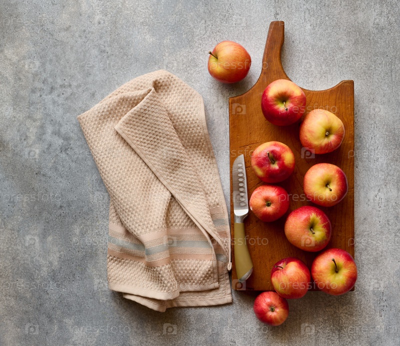 Красные спелые яблоки на деревянной доске на сером каменном столе, вид сверху