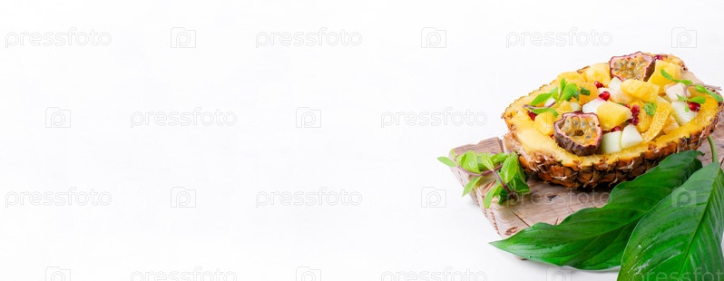 Веб-баннер с фруктовым салатом, который подается внутри половинки ананаса. Апельсин, яблоко, банан, ананас, гранат и маракуйя нарезаны и смешаны в натуральной миске. Макет с копией пространства
