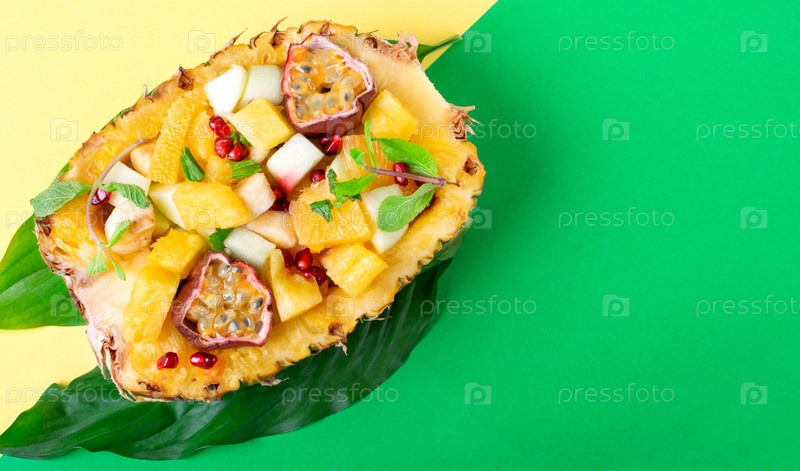 Фруктовый салат подается внутри половинки ананаса. Апельсин, яблоко, банан, ананас, гранат и маракуйя нарезаны и смешаны в натуральной миске