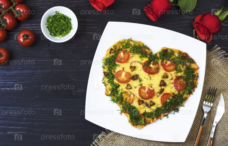 Еда на День святого Валентина. Пицца в форме сердца с зеленью, на белой тарелке, на мешковине, на темном фоне, рядом с красными розами и помидорами черри. Вид сверху. Копировать пространство